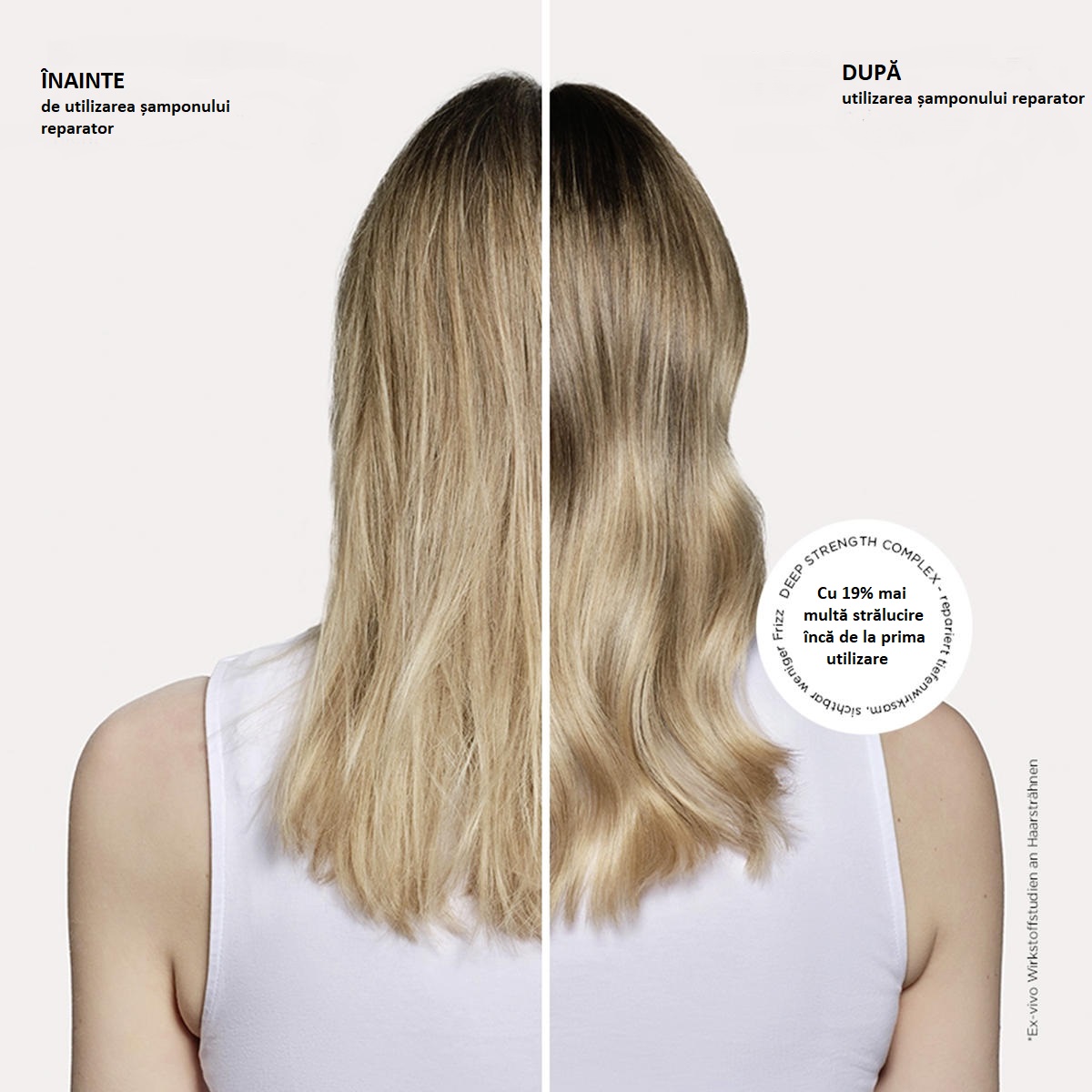 ȘAMPONUL natural reparator cu complex Deep Strength din cheratină vegetală și colagen vegan repară părul deteriorat și întărește structura părului. Cheratina vegetală și colagenul vegan refac zonele deteriorate ale părului, îmbunătățesc elasticitatea și protejează suplimentar împotriva influențelor externe. Șamponul atenuează ruperea firului de păr și îl protejează de căldură, radiații UV și influențe externe* – ideal pentru părul deteriorat.
