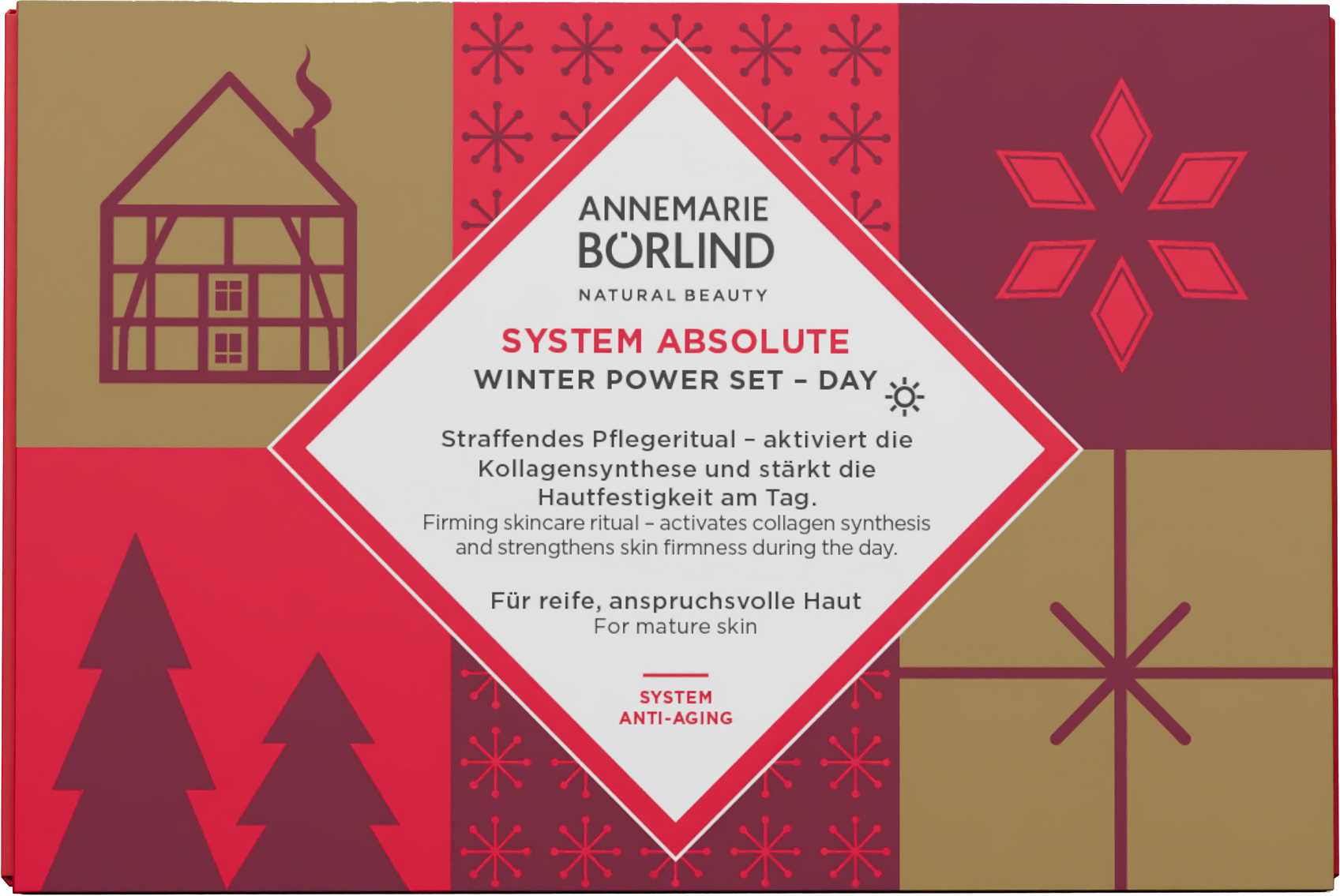 Experimentează sau oferă cadou mici ritualuri de îngrijire ca o pauză reconfortantă în viața de zi cu zi. Seria noastră SYSTEM ABSOLUTE cu extract de alge verzi într-o matrice 3D de ingrediente active din arborele tara activează în mod specific producția de colagen și elastină, regenerează pielea și oferă o protecție optimă – în special în sezonul rece. Setul Winter Power Day este ritualul tău de îngrijire anti-îmbătrânire: întărește fermitatea pielii, netezește vizibil ridurile și asigură un ten ferm și plin de vitalitate.